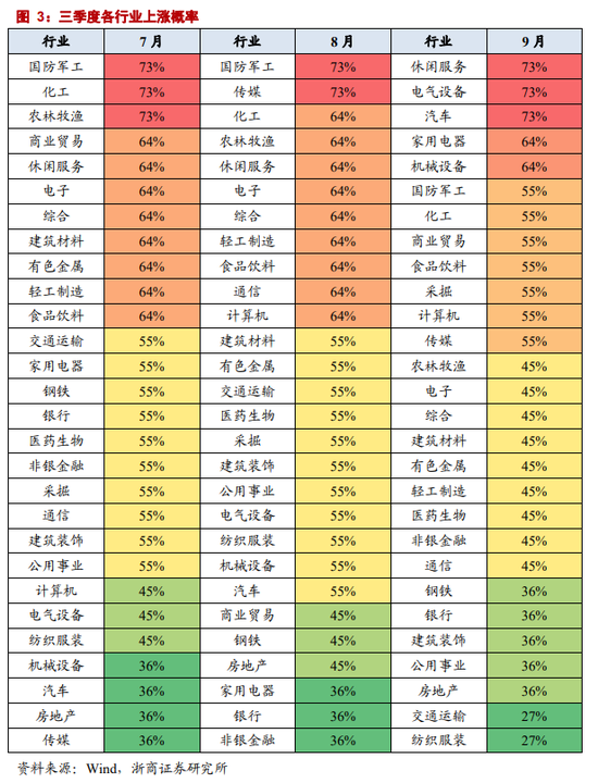 三季度,中报季自7月陆续开幕,一方面,各行业上涨概率整体较二季度提升;另一方面,横向比较,军工、化工、休闲服务等上涨概率居前。