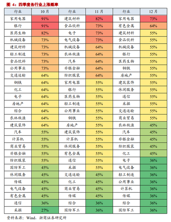 12月份,各行业整体上涨概率出现下降,其中,家电上涨概率最高,达73%;有色金属上涨概率次之,达64%。
