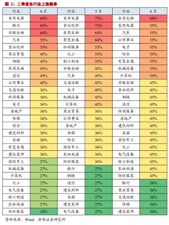 二季度:消费类占优。一方面,相较于一季度,各行业上涨概率整体下降;另一方面,横向比较下,以医药、食品饮料、家电为代表的消费类上涨概率居前。