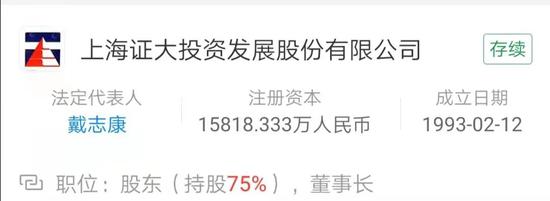 天眼查显示,上海证大投资发展股份有限公司早在1993年2月就已经成立,公司法定代表人为戴志康,其持有公司75%的股权。