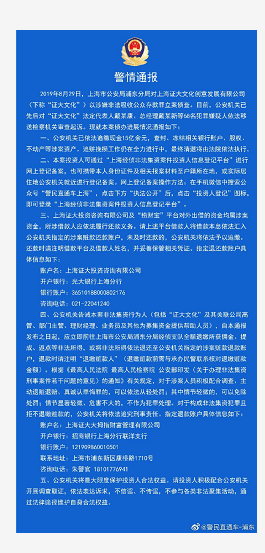 浦东警方在该通报中还表示,经过调查,证大公司在未取得国家相关金融资质许可的情况下,通过旗下“捞财宝”线上理财平台(上海证大爱特金融信息服务有限公司)、“证大财富”线下理财门店(上海证大大拇指财富管理有限公司)向不特定社会公众非法吸收存款,目前该案件正在进一步侦查中。