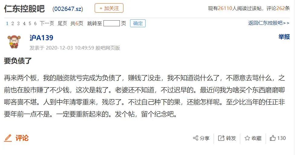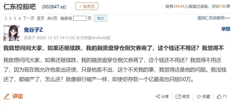 股吧又网友问:“如果还继续跌,我的融资盘穿仓倒欠券商了,这个钱还不用还?” 还有网友表示:“之前赚钱了没走,这次栽了;人到中年清零,残忍了。”