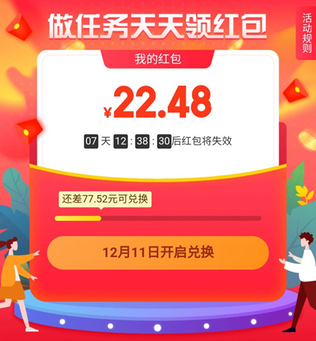 登录永辉生活APP,按照规则完成每日签到、下单、逛会场、参加抽奖等任务,即可领取大额红包。通关可赢100元券包。天天来,天天领。红包积分累计集满100元,可在12月11日兑换等额优惠券包。
