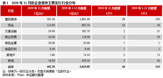 2.企业债券发行人主要集中于建筑装饰行业,综合行业发行规模增长明显