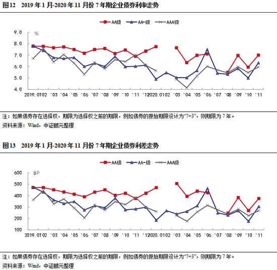 与上月相比,2020年11月,7年期企业债各级别的平均发行利率均上行,其中,AA+级上行133BP,涨幅最大,AA级上行105BP,AAA级上行49BP;利差方面,7年期企业债各级别的平均发行利差均扩大,AAA级、AA+级和AA级分别扩大106BP、129BP和45BP。