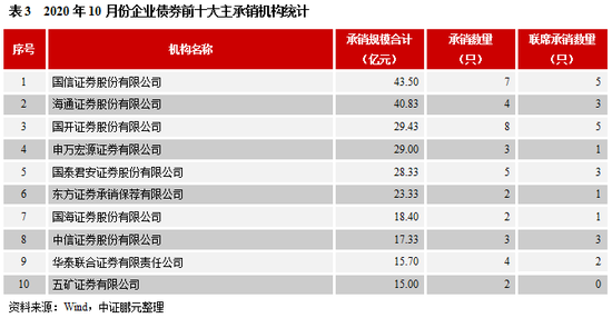 就承销机构而言,2020年11月共有30家机构参与企业债券的承销工作。国信证券承销43.50亿元,位居第一;海通证券以承销40.83亿元位居第二,国开证券承销29.43亿元,位居第三。前五大承销商,承销规模合计占比43.4%。