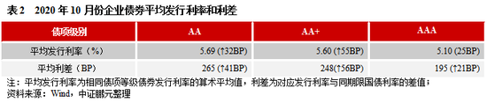 2020年11月,企业债券最高发行利率为7.50%,较上月上行70BP;最低发行利率为3.17%,较上月下行55BP。从债券级别来看,与上月相比,本月各级别企业债平均发行利率上行,利差扩大,其中AA+级变动幅度最大,平均发行利率上行55BP,平均发行利差扩大56BP。