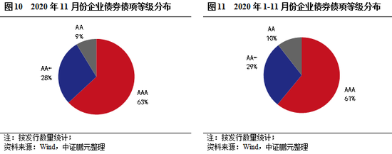 2020年11月发行的企业债债项信用等级在AA+级及以上。具体来看,AAA级发行29只,占比63%,较上月下降6个百分点;AA+级发行了13只,占比28%,较上月上升4个百分点;AA级发行4只,占比9%,较上月上升2个百分点。总体而言,11月发行AA+及以上的高级别品种数量占比91%,较上月下降2个百分点。综合2020年1-11月情况来看,AAA级占比61%,同比上升17.1个百分点;AA+级占比29%,同比下降1.8个百分点;AA级占比10%,同比下降15.2个百分点。