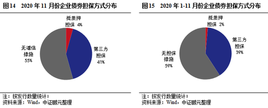 2020年11月,企业债有担保的债券共计21只,数量占比45.6%,较上月小幅上升0.8个百分点,其中,AA级主体中选择增信发行的债券数量占比为80.0%,较上月下降4.6个百分点;AA+级主体中选择增信发行的债券数量占比27.2%,较上月下降6.1个百分点;AA-级主体发行的债券中除一只项目收益债,均采用第三方担保增信至AAA。综合2020年1-11月份,企业债有担保措施的债券140只,增信比例41%,较上年同期下降2.3个百分点,主要是2月-3月发行主体集中在高等级,采取担保措施的债券比例较低。4月以来低等级主体增加,担保比例提升至40%以上。本月,AA-级别主体增加,而AA级主体中担保比例下降。