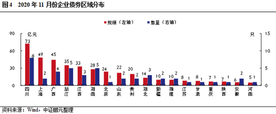 2020年11月,共有18个省份发行了企业债券。其中,四川省企业债券的发行规模最大,为72.60亿元;其次是上海市和广西省分别发行48.50亿元和44.50亿元,位居第二、三位;浙江省和江西省分别发行35亿元和330亿元,规模也较大。从发行数量上看,四川省发行8只,浙江省和湖南省各发行5只,广西省发行4只,其他城市发行数量在3只及以下。与上年同期相比,11月有14个省份发行规模同比增长,其中,上海和广西省发行规模同比增加38.8亿元和48.50亿元,增加规模最大;5个省份发行规模同比减少,除广东省和云南省2个省本月未发行外,陕西省同比下降77%,降幅最大。