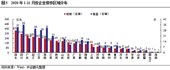 综合2020年1-11月份情况来看,湖北省以370.79亿元的发行规模位居首位;四川省以313.90亿元的发行规模位居第二;广东省和浙江省分别发行282亿元和264.90亿元,其余省份发行规模在250亿元以下。从发行数量上看,四川省发行35只,位居首位;湖北省发行32只,位居第二位;湖南省和浙江省分别发行31只和30只,其他省份发行数量在30只以下。与上年同期相比,14个省份发行规模出现增长,其中,福建省企业债发行规模累计同比增长133%,上海、湖南省和广西省涨幅在90%以上,此外,天津上年同期未发行企业债,本年度发行60亿元;15个省份发行规模出现下降,山西省、贵州省和海南省下降幅度在40%以上,降幅较大;此外,辽宁、吉林、宁夏和西藏本年尚未发行。