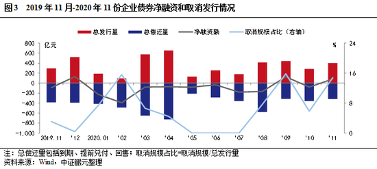 从净融资情况来看,11月企业债券总发行规模402.30亿元,总偿还规模319.95亿元,本月表现为净发行82.35亿元,上年同期为净偿还91.76亿元。此外,受华晨、永煤违约的影响,2020年11月有7只企业债券取消发行,原计划发行规模合计59.40亿元。2020年1-11月份,企业债净融资-1,100.87亿元,较上年同期净偿还量减少349.61亿元,累计取消发行企业债34只,原计划发行规模273.6亿元。