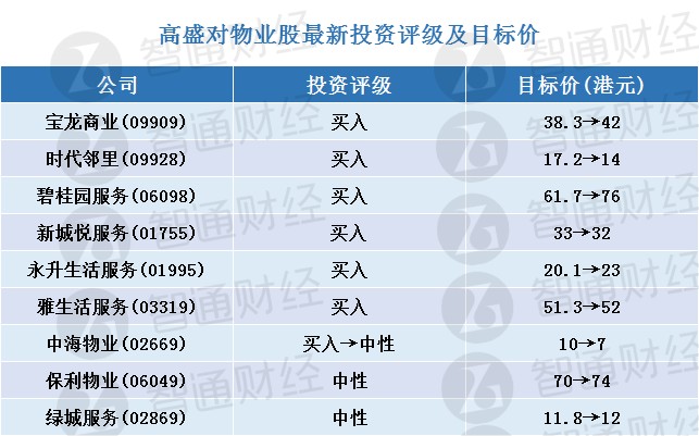 高盛将中海物业(02669)评级由“买入”降至“中性”,目标价下调30%至7港元,并重申对宝龙商业(09909)、时代邻里(09928)、碧桂园服务(06098)、新城悦服务(01755)、永升生活服务(01995)及雅生活服务(03319)“买入”评级。