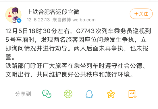 12月6日,@上铁合肥客运段官微对此回应称,列车员发现两名旅客因座位问题发生争执,立即询问情况并进行劝导。两人后面未再争执,也未报警。