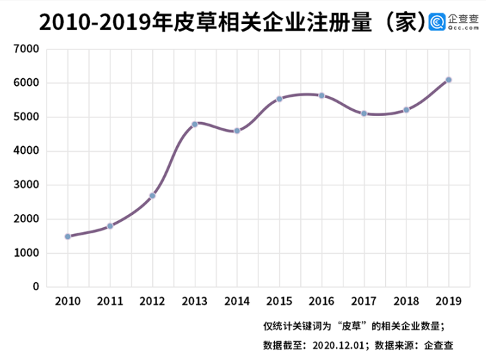 2010年以来的十年之间,皮草相关企业注册量波动增长。企查查数据显示,2013年是相关企业注册量增速最大的一年,共注册相关企业4784家,同比增长78%,随后几年间每年的注册量较为平稳,2019年新增企业超6000家。有资料显示,2016年后中国皮草行业销售收入开始下降,近年来市场出现产能过剩、供大于求的情况。