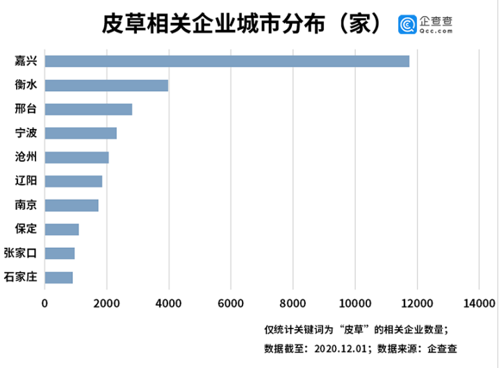 从城市分布来看,著名的“皮革之都”海宁所在的嘉兴市,以1.18万家企业在城市排名中占据第一位,河北衡水和邢台分别以0.4万家和0.28万家排名二、三位。此外,宁波、沧州以及辽阳等市的相关企业数量也较多。
