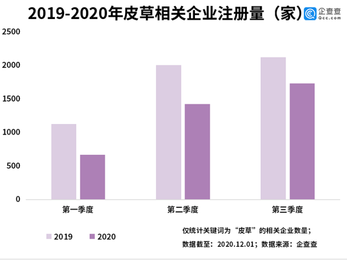 企查查数据显示,2020年前三季度共注册皮草相关企业3831家,同比减少27%。其中,第三季度共注册相关企业1735家,同比下降18%,环比增长21%。同时,2020年截至目前共注销皮草相关企业1388家。
