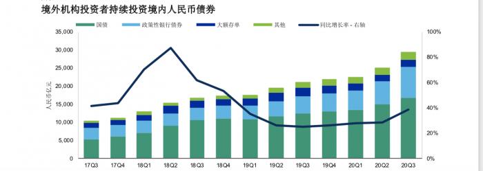 报告表示,截至2020年第三季度,境外机构投资者持有的人民币债券从2019年第三季度末的人民币2.1万亿元升至人民币2.9万亿元, 同比上升39%。第三季度中,7月外资对人民币债券的投资达到人民币1,650亿元的月度净流入,创历史新高。