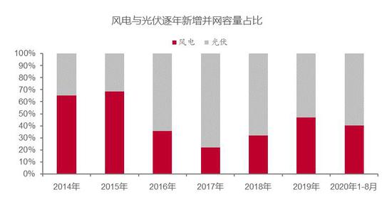 而在今年结束的十三五规划中,非化石能源占比要达到15%,据国家能源局的数据,2019年我国一次能源总消耗量约为48.6亿吨标准煤,其中非化石能源消耗量约为7.4亿吨标准煤,占比15.3%,已提前完成了十三五的目标。非化石能源最主要的消费模式就是新能源发电。