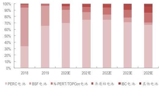 目前光伏电池市场主要以PERC电池为主,BSF传统电池为辅。在2018年签,PERC电池市场占有率仅30%,但是由于PERC转化效率更高,市场对于PERC电池的认可度较为集中,在短短几年中,PERC电池的市场占有率就超过了65%,且未来可能会进一步提高。
