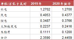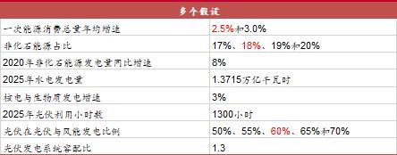 首先我们利用2019年的数据以及2020年已公开的数据估算2020年各类能源的发电量。截至10月,风电、核电、太阳能发电以及生物质发电量相比去年同比分别增长9.6%、6.3%、7.4%以及23.7%,根据实际发电量计算这四种能源同比增长为9.19%,我们按偏保守的8%计算,同时由于水电上半年枯水期等原因下降,我们按照2019年水平计算,2020年这五种主要非石化能源发电量约为2.4461万亿千瓦时。由于水电投资周期较长,目前看,未来将投产两个世界级大型水电站分别是乌东德电站和白鹤滩电站,假设这两个电站在2025年均投入使用,那么水电发电量至2025年增加至1.3715万亿千瓦时。