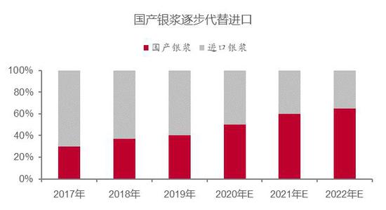 过去银粉与银浆技术工艺主要集中在海外厂商手中,高精细银粉主要依靠日本进口为主,而银浆则以贺利氏、杜邦、三星和硕禾为代表为主。不过在2018年,随着国产产品性能和品质的持续提升,部分国产银浆企业已逐步替代海外竞争对手。到2019年,国产正银全球市场占有率为40%,出货量950吨,年出货量超过100吨的企业包括无锡帝科、深圳首骋、苏州晶银和常州聚和,进口浆料企业正银出货量大约在1450吨左右,主要就是前述4家,每家年出货量在200吨左右。