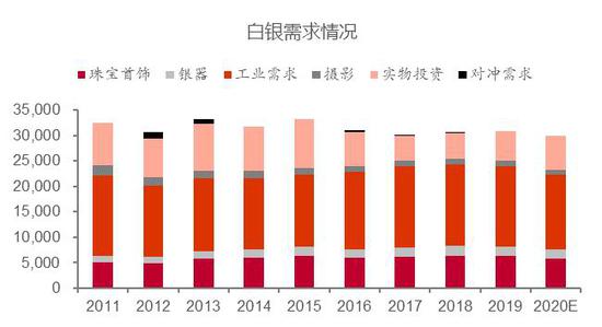 从需求看工业需求占了半壁江山,达到14800吨,占比50%,其他如珠宝首饰需求5800吨,银器需求1700吨,摄影冲洗硝酸银需求不足1000吨,并且在不断下滑,而另一个实物银币需求大概再6700吨左右,尤其是随着今年白银市场的大幅上涨,银币实物投资需求大幅上升,比去年增加了1000吨左右。
