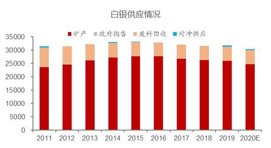 根据世界白银协会发布的根据“焦点金属”公司统计的平衡表,2020年白银整体供应约在30000吨,其中矿山白银24800吨,废料回收提供的供应5300吨,剩下的是极少部分属于各国央行抛售以及企业套保交割部分。