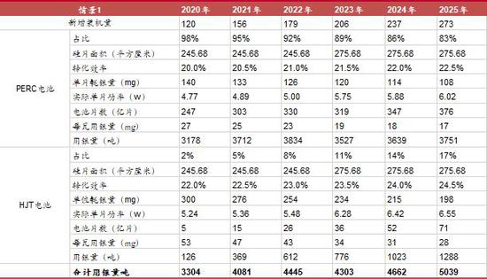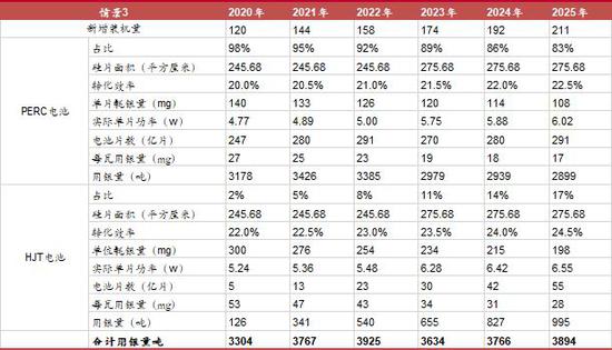 从目前市场普遍采用的技术手段看,PERC电池普遍在正面和背面涂有银浆,一般正面银浆用量100mg,背面银浆用量40mg,合计一片电池140mg。而目前硅片的面积普遍在156平方厘米,转化效率达到23.5%,由此计算单片功率在5.77w左右。如果2020年全部新增光伏装机都采用PERC电池,那么对应的光伏电池量约为216亿片,那需要的耗银量约为3024吨。当然以上计算假设过于简单,没有考虑硅片尺寸的变化、封装损耗率、光伏电池技术变化以及技术进步导致的用银量下降等原因。