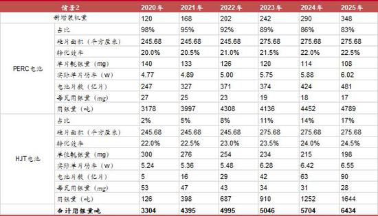 对此我们设计了三个场景,情景1对应基准情形,即2021年全球光伏装机量增加30%,此后4年年均增幅15%;情景2对应乐观情形,即2021年全球光伏装机量增加40%,此后4年年均增幅20%;情形3对应悲观情形,即2021年全球光伏装机量增加20%,此后4年年均增幅10%。同时假设PERC电池和HJT电池用银量每年分别下降5%和8%,同时考虑92%的银浆含银量以及97%的封装损耗情况,计算出三种情境下白银的需求情况