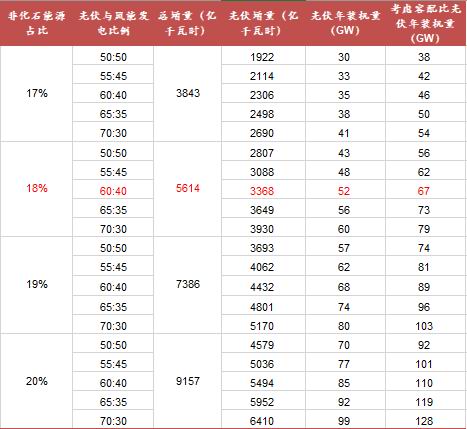 根据能源局的统计,过去几年中新增光伏发电与风能发电中光伏的占比大约在40%-80%之间(2017年为80%,分布式电站因补贴大爆发)。因此我们分了5种情况计算。按照50%、55%、60%、65%、70%占比计算。按照偏保守的一次能源年均增速2.5%,非化石能源占比在十四五期间达到18%,而光伏与风能比例60:40计算,如果考虑容配比,实际的光伏装机量在58GW左右。如果更乐观的话,按照一次能源消费年均增速提高0.5个百分点,也就是3%计算,相同条件下,未来5年光伏年均装机量在67GW左右,而最乐观情况下,年均装机量将达到128GW。