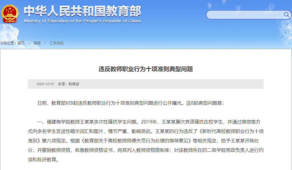 △应援视频截图四、南宁师范大学师园学院教师陈某某性侵学生问题。四、南宁师范大学师园学院教师陈某某性侵学生问题。2020年8月,陈某某私自召集学生到其家中饮酒,一名女学生醉酒后遭陈某某性侵。根据相关规定,待司法机关对其犯罪行为作出判决后,其教师资格将依法丧失,注销并收缴其教师资格证书,五、三峡大学教师郎某某使用低俗不雅方式授课问题。五、三峡大学教师郎某某使用低俗不雅方式授课问题。2020年9月,郎某某使用低俗不雅的图文在校讲授日语课程,影响恶劣。根据相关规定,并对其进行通报批评、取消年度评优资格、扣罚绩效工资;对该教师所在的二级学院进行通报批评。