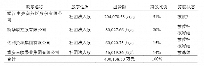 若此次拍卖顺利,新华联集团所持亚太财险17.3%股权将出手,而其手中将仅剩亚太财险2.7%股权。作为亚太财险第二大股东的新华联集团,目前总计持有20%股权,对应出资额80027.66万元。亚太财险第一大股东为泛海控股旗下武汉中央商务区股份有限公司,持股51%。此外股东行列中还有亿利资源集团有限公司、重庆三峡果业集团有限公司,分别持有亚太财险15%、14%股权,值得一提的是,亚太财险其余三家股东的股权也均处于被质押或被冻结状态。