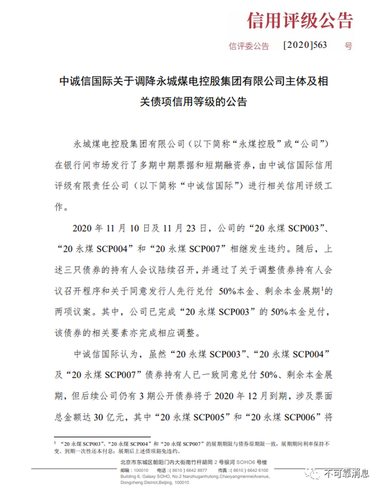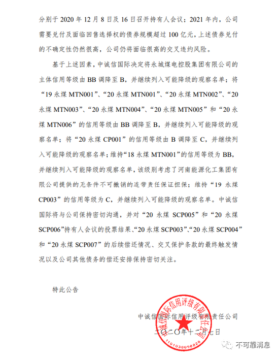 12月7日,中诚信国际调降公告称,虽然“20永煤SCP003”、“20永煤SCP004”及“20永煤SCP007”债券持有人已一致同意兑付50%、剩余本金展期,但后续公司仍有3期公开债券将于今年12月到期,涉及票面总金额达30亿元,其中“20永煤SCP005”和“20永煤SCP006”将分别于12月8日及16日召开持有人会议;2021年内,公司需要兑付及面临回售选择权的债券规模超过100亿元,上述债券兑付的不确定性仍然很高,公司仍将面临很高的交叉违约风险。