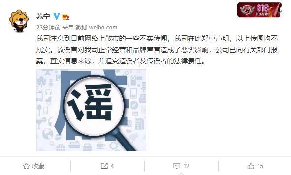 原标题:苏宁回应资金链断裂:传闻均不属实 已向有关部门报案