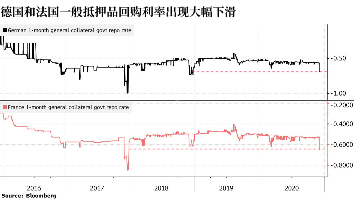 但是,如果投资者未持有借入美元所需的抵押债券,就需要借入债券,这就打击了回购市场。德国和法国的1月期债券借贷成本(也被称为一般担保利率)已经大幅飙升,一般抵押品回购利率分别达到了两年和三年以来的最低水平。持续的负利率意味着债券回购协议的买家(借出现金购买证券的投资者)正在支付利息。
