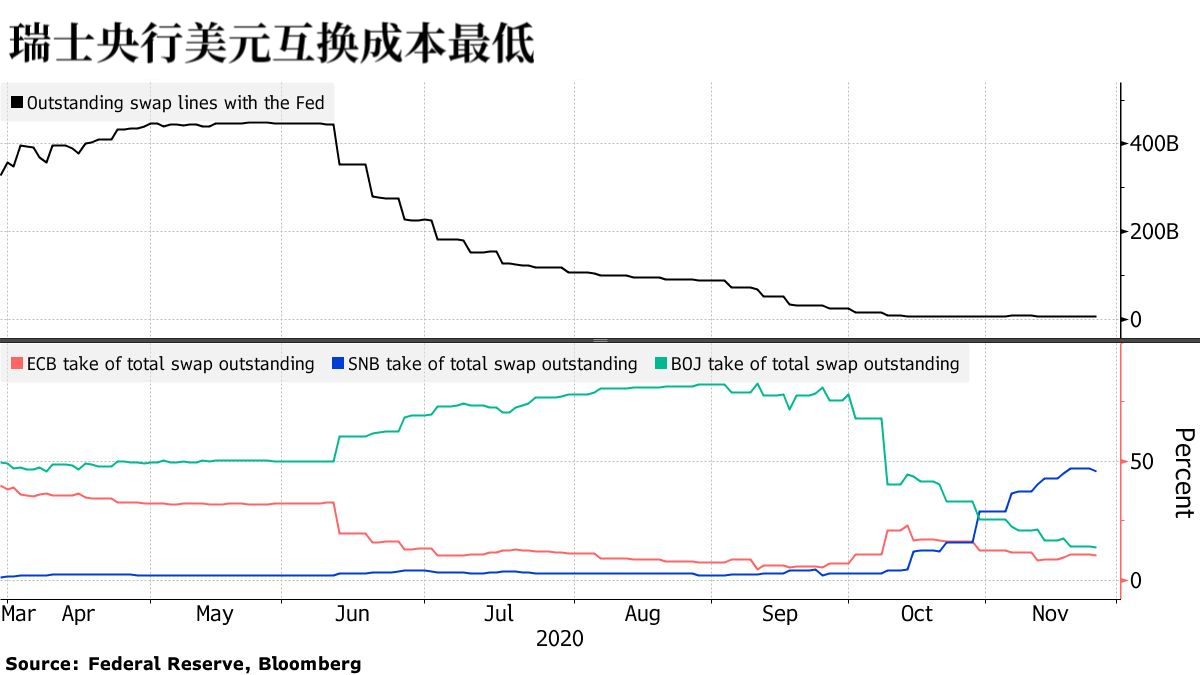通过瑞士央行进行互换纯粹是出于经济考虑。瑞士央行为许多证券提供不折减的互换额度。相比之下,日本央行借出的美元相当于10年期政府债券抵押品价值的98.6%,欧洲央行借出的美元仅相当于德国国债价值的96%。