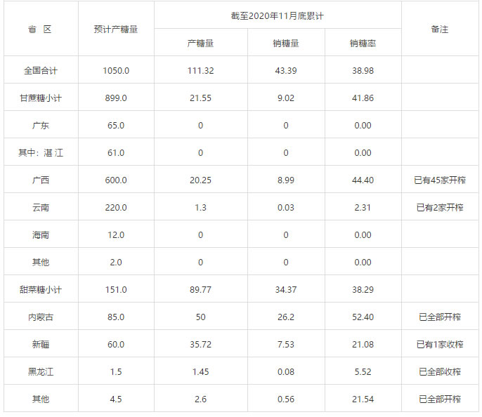 YNTW.COM糖网讯 新疆2020/21榨季截至11月底累计产糖35.72万吨,同比减少4.66万吨,已有一家糖厂收榨;累计销糖7.53万吨,同比减少5.87万吨;产销率21.08%,同比下降12.1个百分点;工业库存28.19万吨,同比增加1.21万吨。