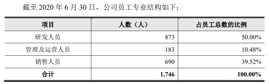 人工智能企业以科技为重,科研人员肯定占据了核心员工中的多数席位。招股书披露,截至2020年6月30日,云从科技研发技术人员873人,占员工总数比例为50.00%。