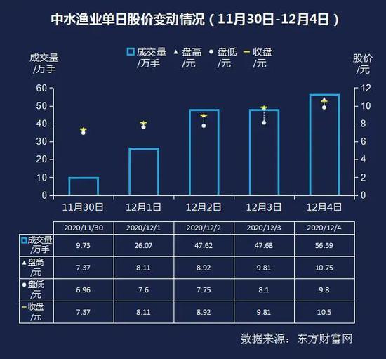 数据显示,12月3日午后,渔业板块持续走强,国联水产(300094.SZ)、大湖股份(600257.SH)、獐子岛(维权)(002069.SZ)等跟涨。当日13时40分,中水渔业涨停,收盘价为9.81元/股,成交量47.68万手,成交额4.33亿元,振幅19.17%,换手率14.93%。这也是中水渔业六日内第五个涨停。