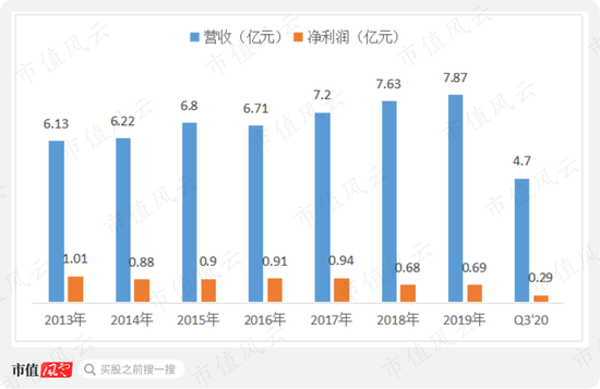 公司的营收由2013年的6.13亿增长至2019年的7.87亿,CAGR为4%。