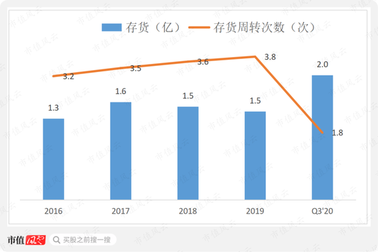 2020年三季度公司存货金额迅速增长至2亿,存货周转率也由2019年的3.8下降至1.8。