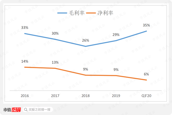 而公司毛利率先降后升的情况下,公司的净利率却持续下滑,由2016年的14%下滑至2020年三季度的6%,主要是由于销售费用率和管理费用率的大幅上升造成的。