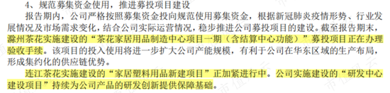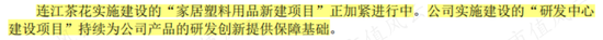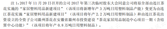 2017年11月,公司将该项目变更分拆为由连江茶花实施年产2.2万吨“家居塑料用品新建项目”和由滁州茶花实施年产0.8万吨“茶花家居用品制造中心项目一期(含结算中心功能)”(下文简称连江项目、滁州项目),两个项目分别使用募投资金2.1亿和1亿。