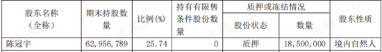 另外,截至2020年三季报,陈冠宇质押股份1850万股,占其持股数量的29%,其质押股份最高比例曾达52%。