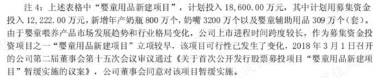 婴童用品新建项目原计划年产奶瓶800万个、奶嘴3200 万个以及婴童辅助用品309万个(套),2018年3月公司以该项目可行性已发生了变化为由,对其暂缓实施,当然至今都没有再实施了。
