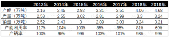 2016年至2019年公司的销量分别为2.89万吨、3.03万吨、3.24万吨、3.21万吨,增长非常缓慢,而且2019年出现了首次下降。