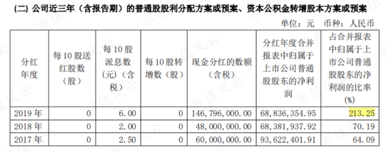 2017年、2018年和2019年归母净利润分别为0.94亿、0.68亿和0.69亿,同期现金分红分别为0.6亿、0.48亿和1.47亿,各期分红金额分别占归母净利润的64%、70%和213%。