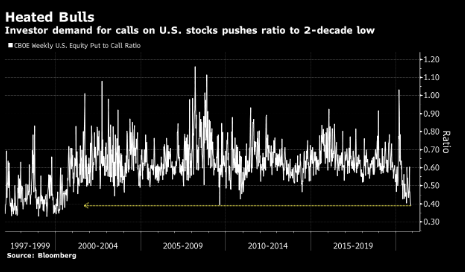 同时,一项美国股市的关键情绪指标已经达到了二十年来的最高看涨水平。上周,每周Cboe看跌期权与看涨期权的交易量比率降至2000年7月来最低,正逢标普500指数创下历史新高之际。