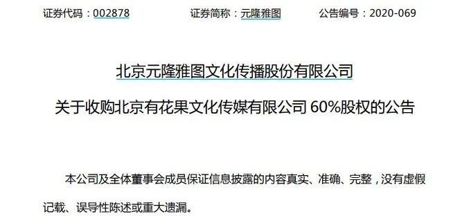 如今,有花果传媒已经成为业内知名的品牌,更获得了上市公司的青睐。12月7日晚间,元隆雅图公告称,拟收购有花果传媒60%股权,转让对价为2.7亿元。